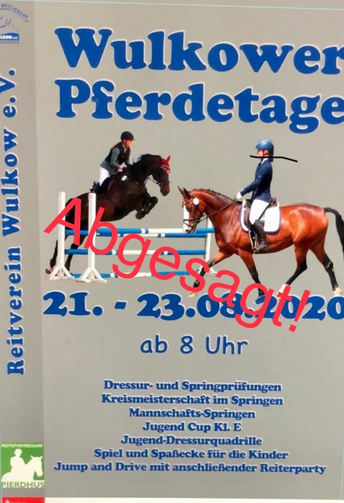 Schweren Herzens müssen wir verkünden, dass die Wulkower Pferdetage 2020 auf Grund der aktuellen Corona Pandemie abgesagt sind.